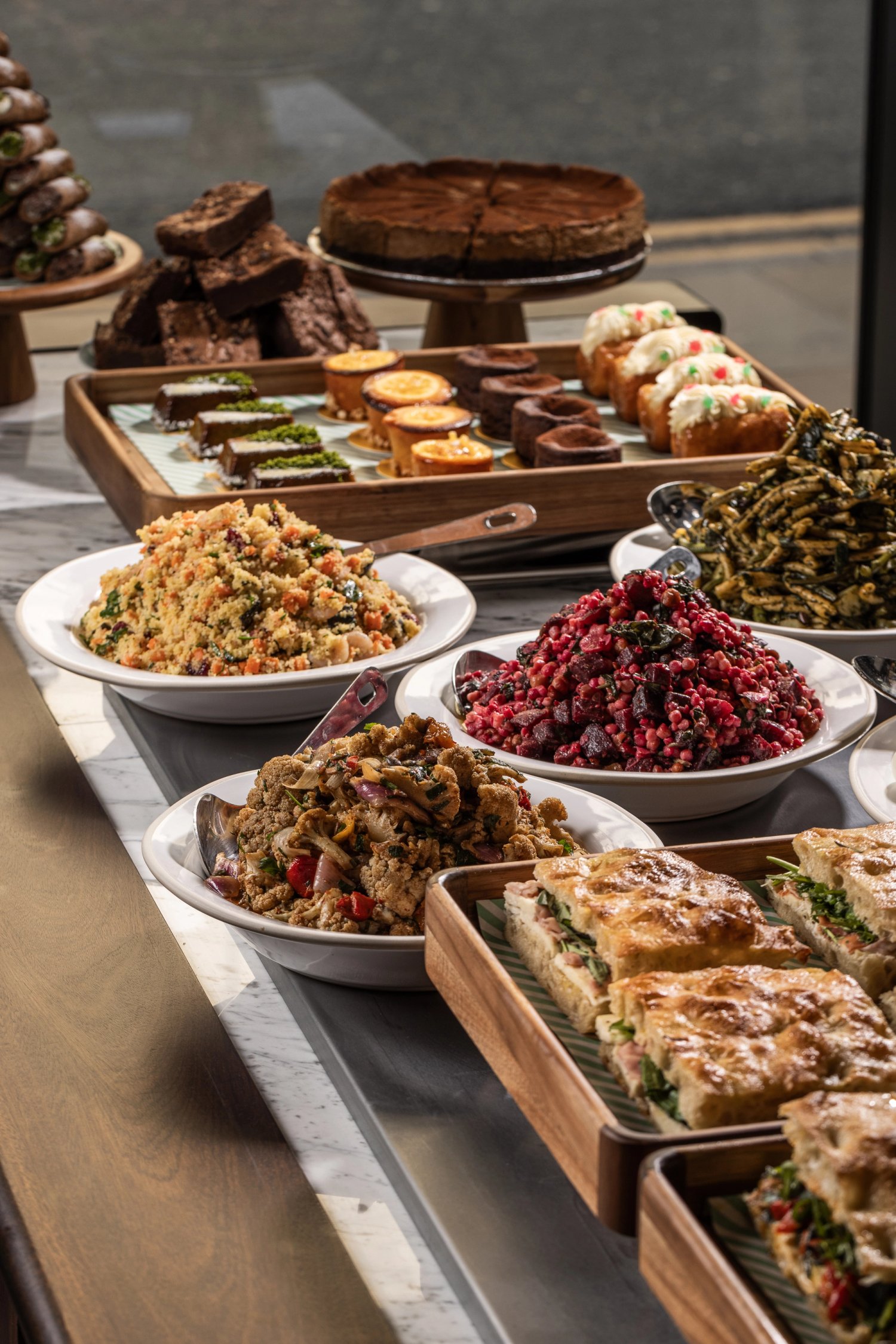 Start your day at the delicatessen with freshly baked goods, pasticcini and cornetti, strong Italian coffee, and breakfast sandwiches or order a range of classic Italian salads or panini for lunch. For an afternoon pick-me-up, our counter will be stocked with favourites like signature Cannoli with Ricotta, Pistachio and Chocolate, Pistachio-filled Bomboloni, and Orange & Polenta Cake.