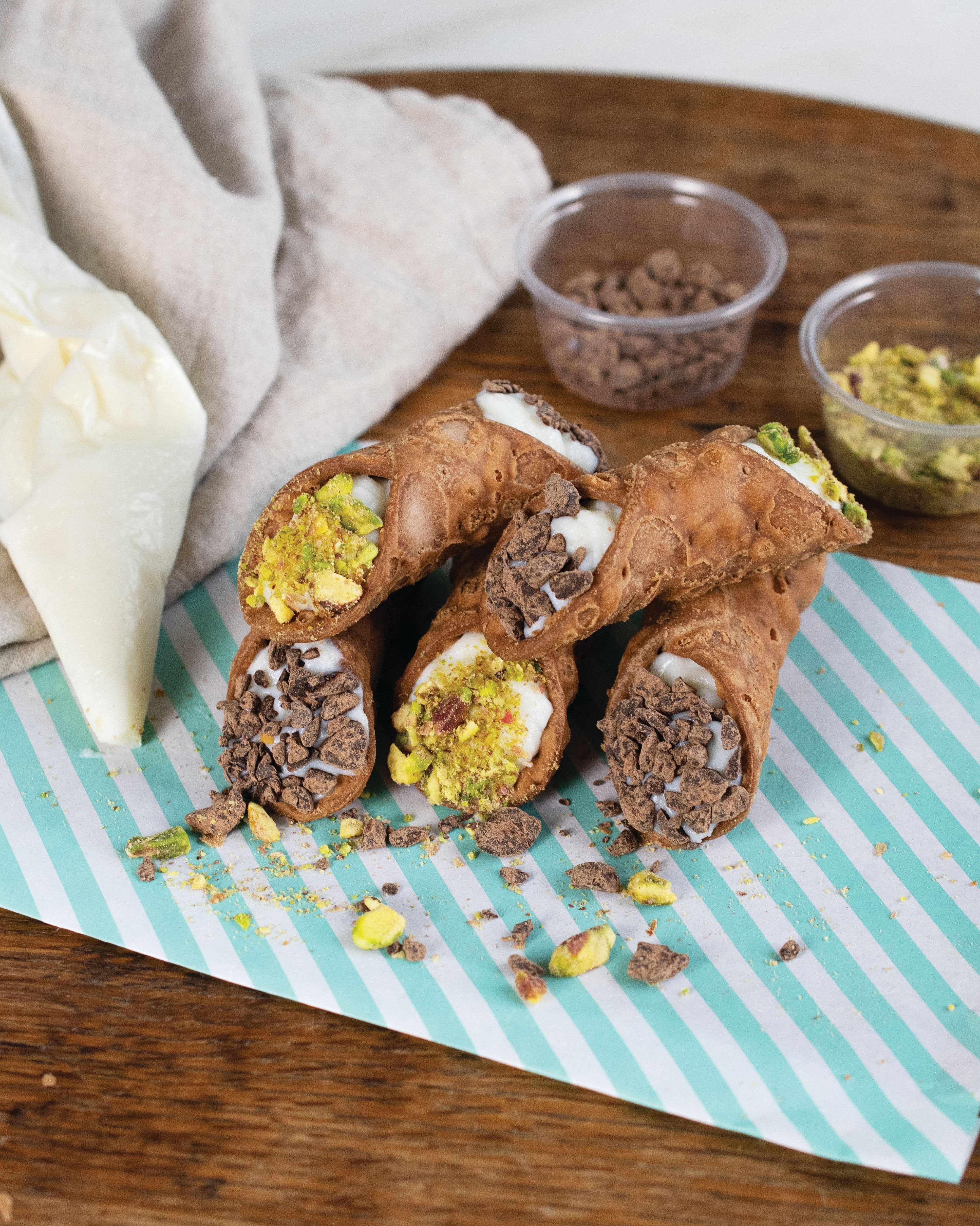 Originally from Sicily these iconic fried pastry shells are filled with sweetened ricotta and decorated with pistachio on one end and chocolate chips on the other. Get the whole family involved by creating your own Cannoli at home as we provide you with everything you need for homemade Cannoli. Best eaten as soon as assembled to keep the crispiness of the shells and the creaminess of the ricotta.