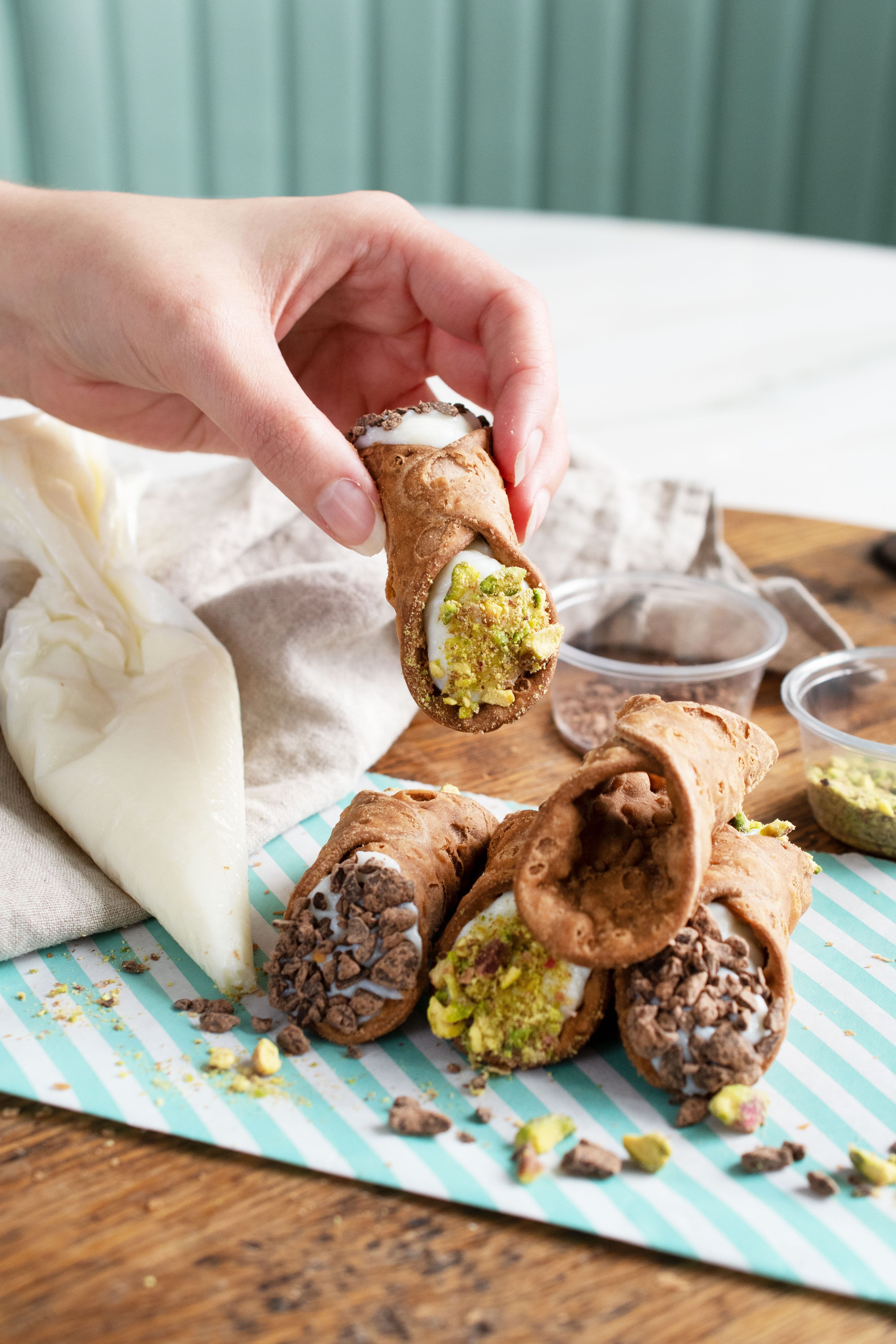 Cut a small hole into the thin end of the piping bag and press the top of the bag slightly until you see the ricotta slowly coming out of the opening. Hold one Cannolo in one hand and pipe from the middle of the Cannolo outwards, ensuring it’s properly filled. Turn the Cannolo around and fill the other side from the middle outwards. Press one end of the filled Cannolo into the tub with pistachios and press down slightly. The pistachios will stick to the sweet ricotta. Turn around and repeat with chocolate chips. Serve immediately.